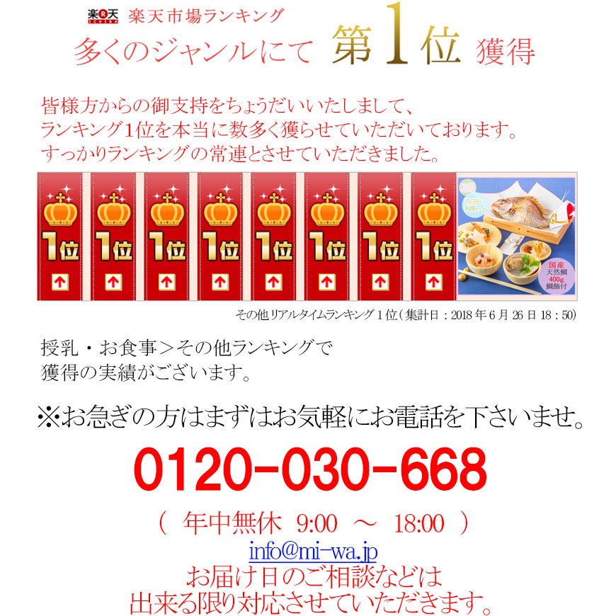 上の子2人は手作りでお食い初めをしましたが、蛤を売っているところがなかなか無くて、探すのが大変だったので、今回はこちらを利用させていただきました。赤ちゃんがいると、ゆっくりお料理ができないので本当にラクで鯛の見た目も立派でしたし、大満足です!