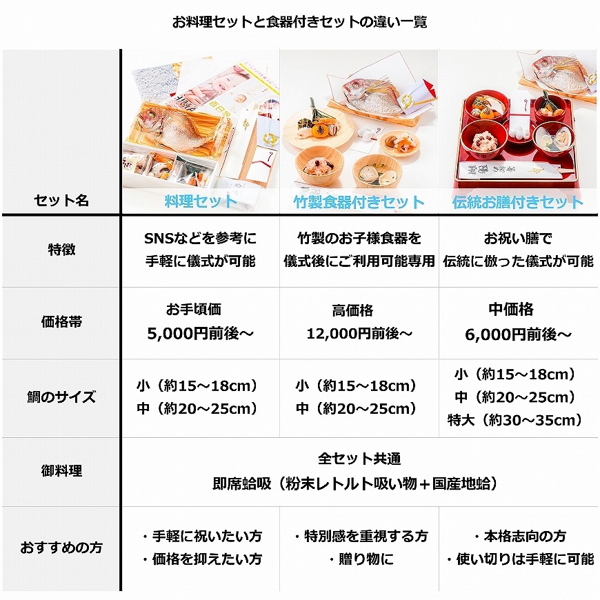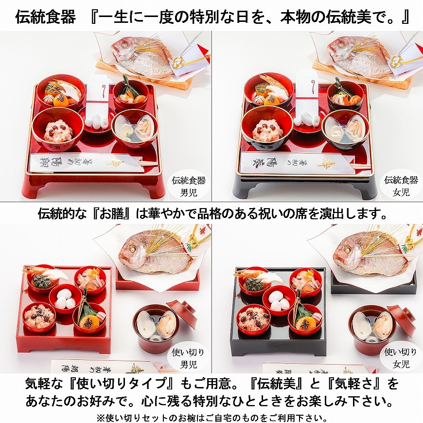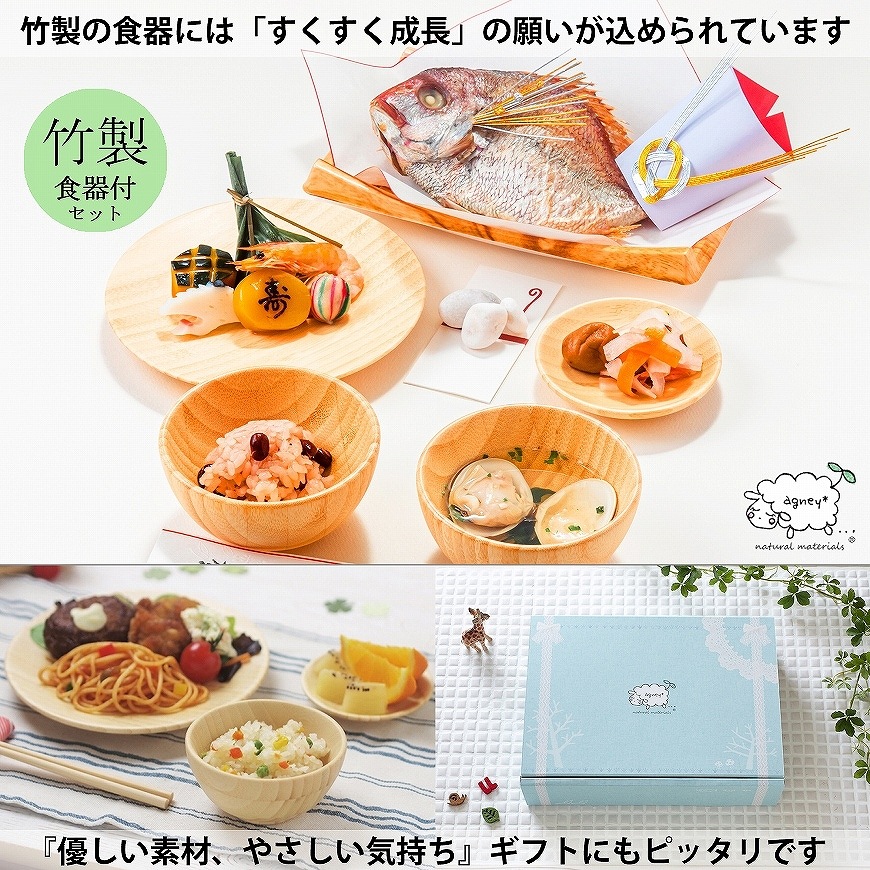 お料理のみのセット以外に、お祝い膳付き(男児朱色・女児黒色)・すくすく成長するようにと竹製のお子様食器付きなどもございますので、ご用向きに合わせてご利用下さいませ。